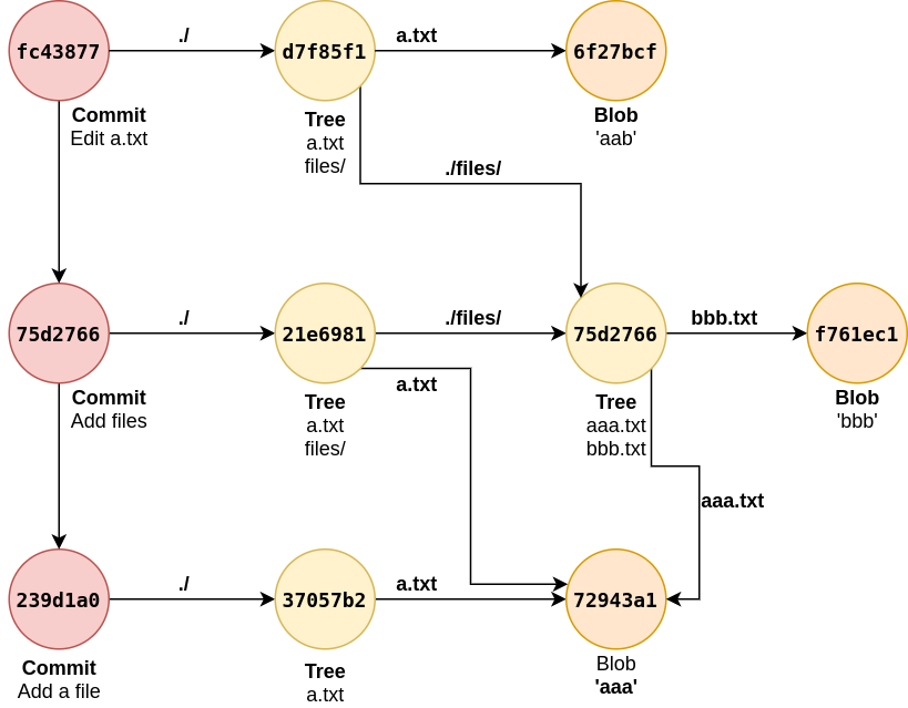It can been seen how git reused common blob containing aaa between two commits. Only 7 objects