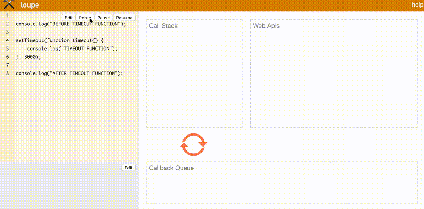 console.log(“BEFORE TIMEOUT FUNCTION”);setTimeout(function timeout() {