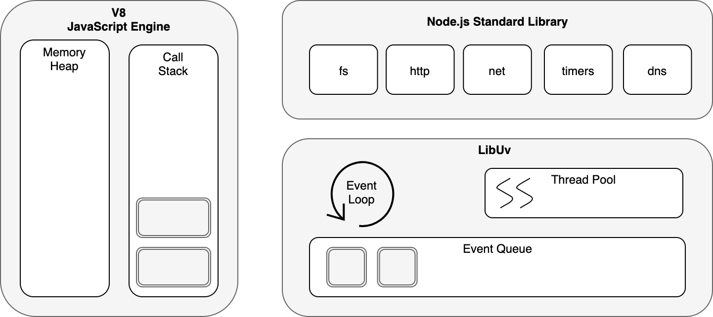 - LibUv: Consists of Thread Pool and handles Event Loop, Event Queue. It’s multi-platform C library focusing on asynchronous I/O operations.